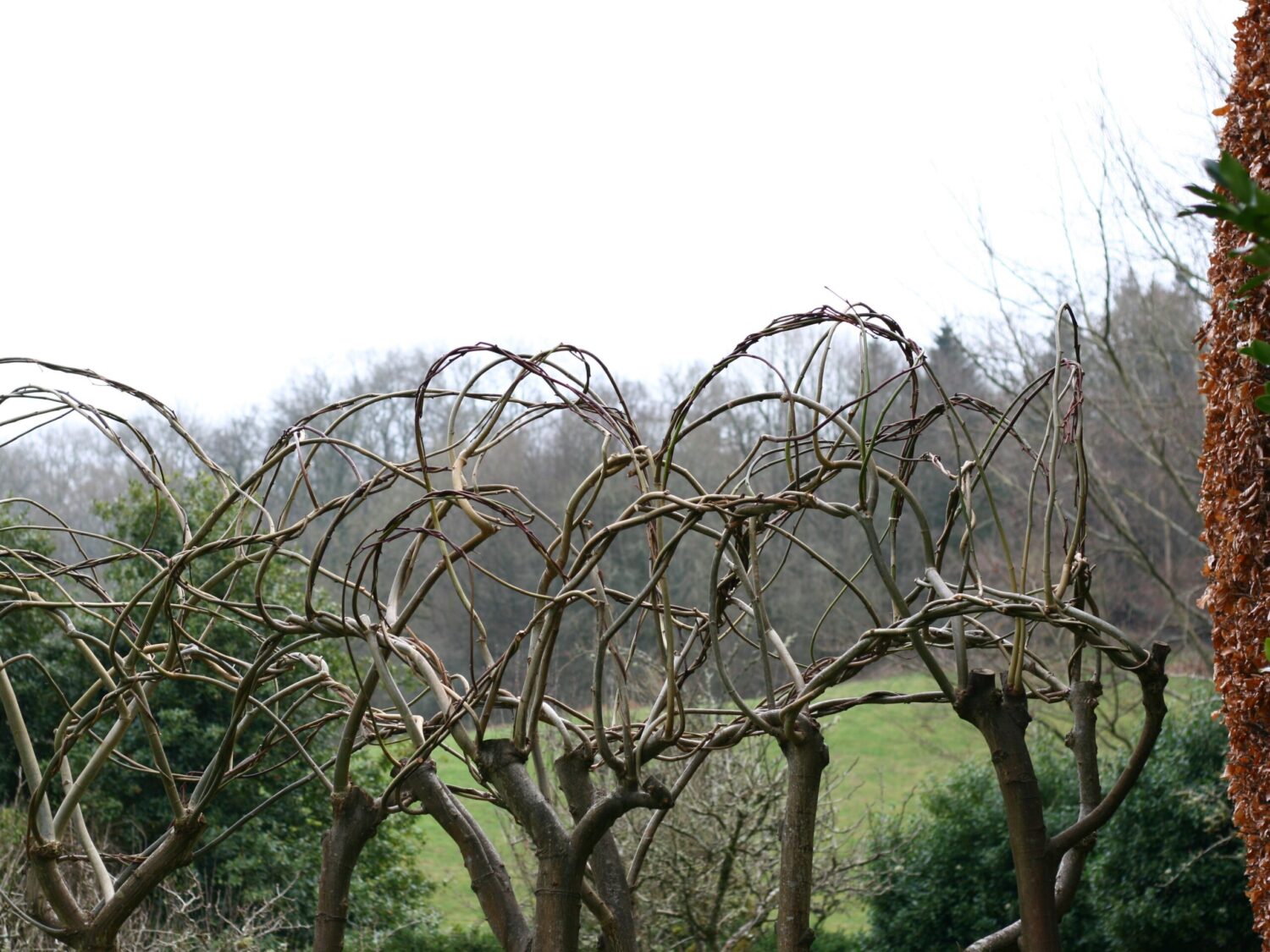 It is saved in late spring by uniform clumps of snowflake (Leucojum aestivum) and in summer by a small cadre of bee orchids (Ophrys apifera). The pleached limes however are bothersome. In my first winter I couldn’t bring myself to repeat the same pattern. Instead, when the conversation of pruning began, rather than blithely remove stem after stem, I decided to twine some together to create visual interest and engage with the spaces between the stems. Each year builds on the previous and the sculpture becomes heavier and more intertwined.